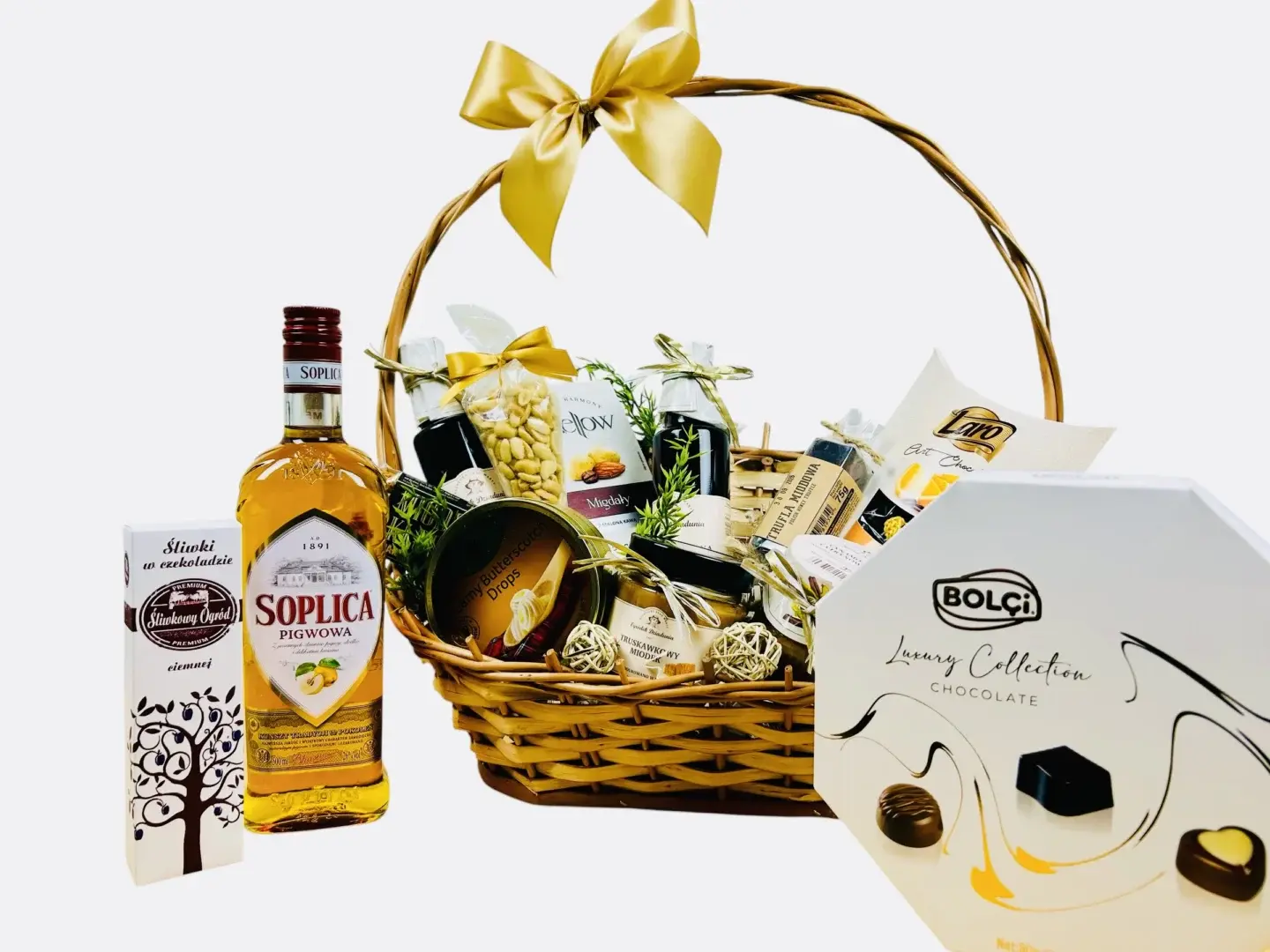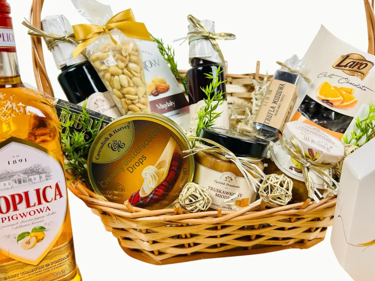 Kosz prezentowy Lare to elegancka propozycja dla osób ceniących intensywne smaki i naturalne składniki. Kompozycja wykwintnych czekolad, aromatycznej herbaty i orzechowych przysmaków w ręcznie wykonanym wiklinowym koszu tworzy prezent, który sprawdzi się zarówno w roli upominku prywatnego, jak i firmowego.