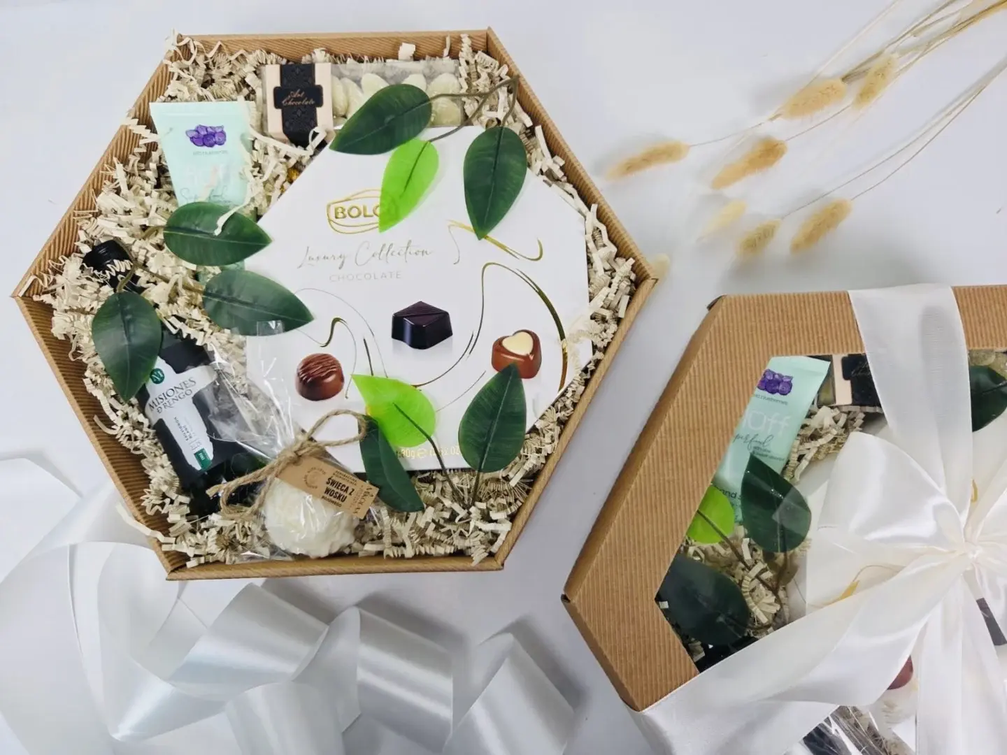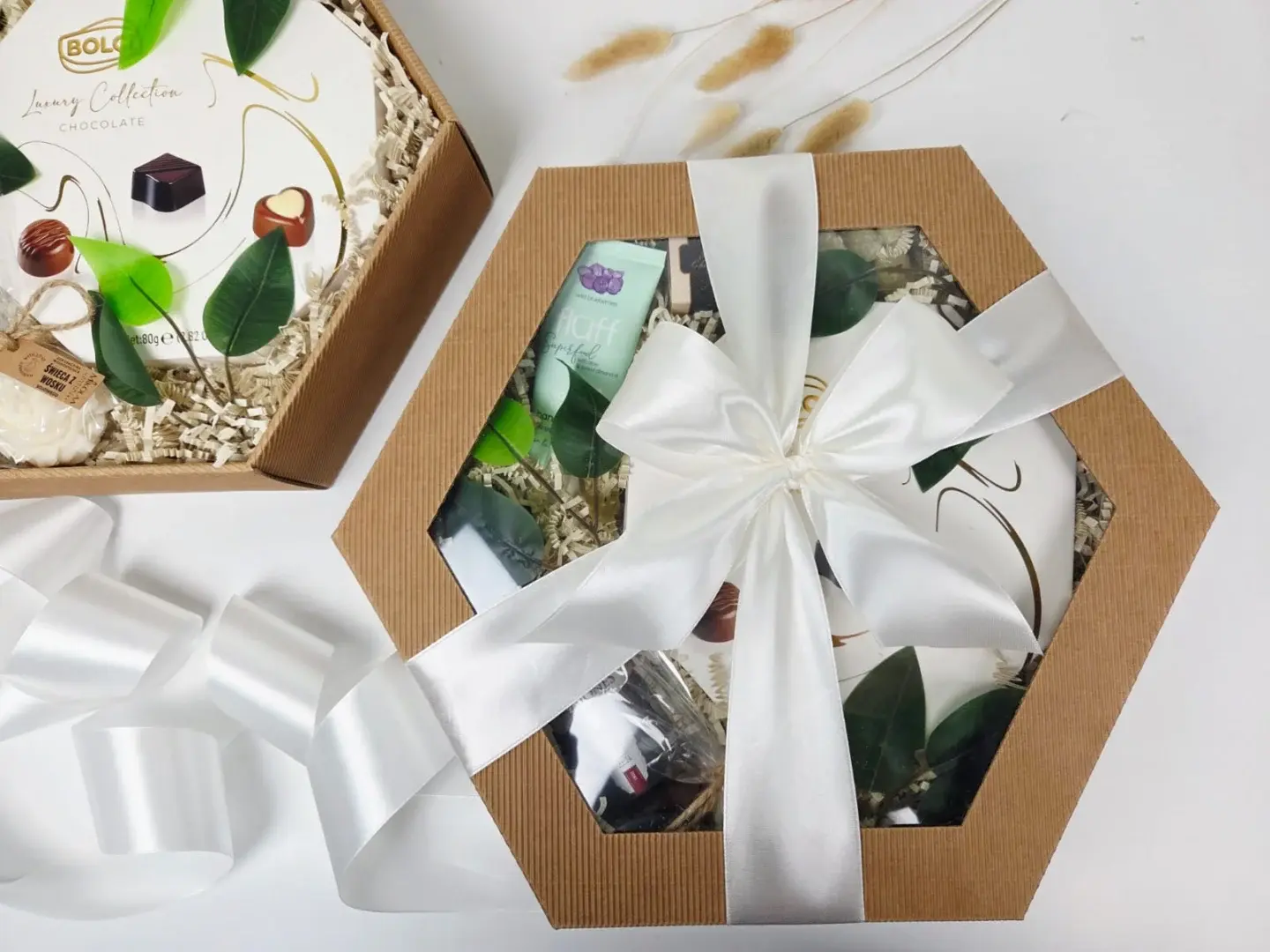 Wyróżnia się nie tylko wysoka jakość produktów, ale także niezwykle estetycznym wyglądem. Dbałość o szczegóły i harmonijne połączenie kolorów nadają mu stylowy charakter. Jeśli wolisz, Możesz jednak zdecydować się na inny wariant kolorystyczny – wystarczy wybrać jeden z dostępnych odcieni wstążki, aby idealnie dopasować zestaw do gustu osoby obdarowywanej.