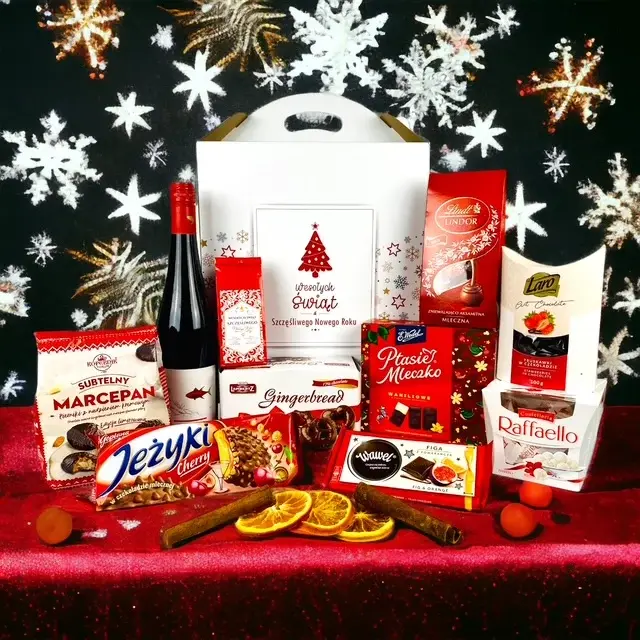 Wino Contntrasto czerwone 750ml, Praliny Lindt Lindor 100g, Pierniki z marcepanem Kopernik 150g, Truskawki w czekoladzie 100g, Bombonierka Raffaello 150g, Czekolada Wawel świąteczna 90g, Herbatka świąteczna 50g, Ptasie mleczko Wedel 330g, Jeżyki ciastka 140g, Pierniki w czekoladzie 250g.