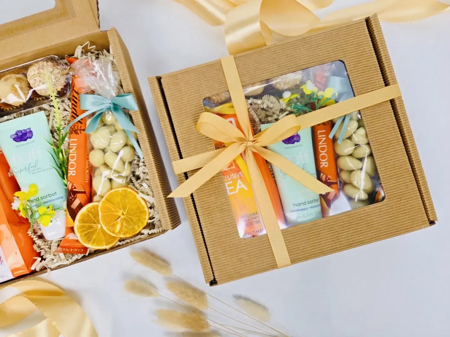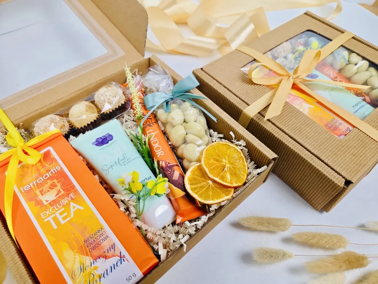 - Wypełnienie, ozdoby, wstążka – starannie dobrane dekoracje nadające zestawowi prezentowemu wyjątkowy i estetyczny wygląd.