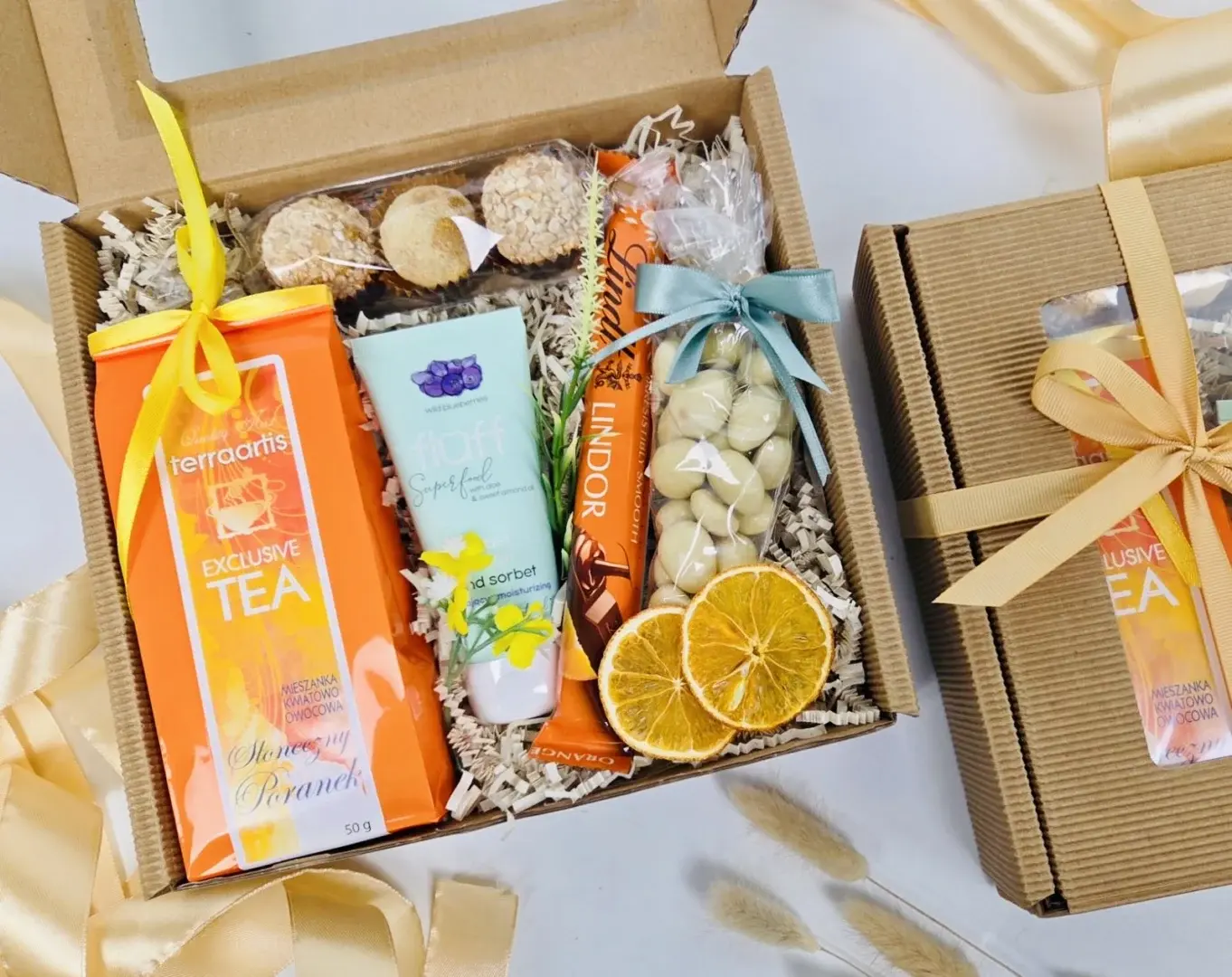 Nie tylko wysoka jakość produktów, ale też niezwykle estetyczny wygląd. Zestaw prezentowy zachwyca dbałością o detale i stylowym połączeniem kolorów. Możesz jednak zdecydować się na inny wariant kolorystyczny. Wystarczy, że wybierzesz jeden z dostępnych odcieni wstążki, by dostosować się do upodobań osoby obdarowywanej.