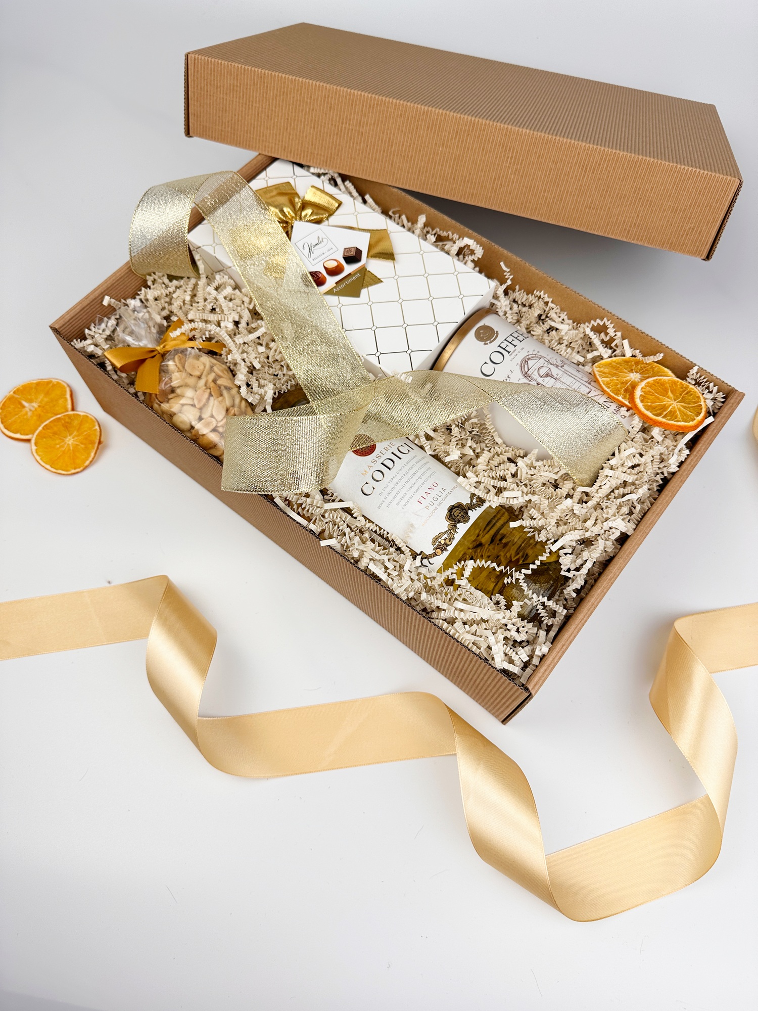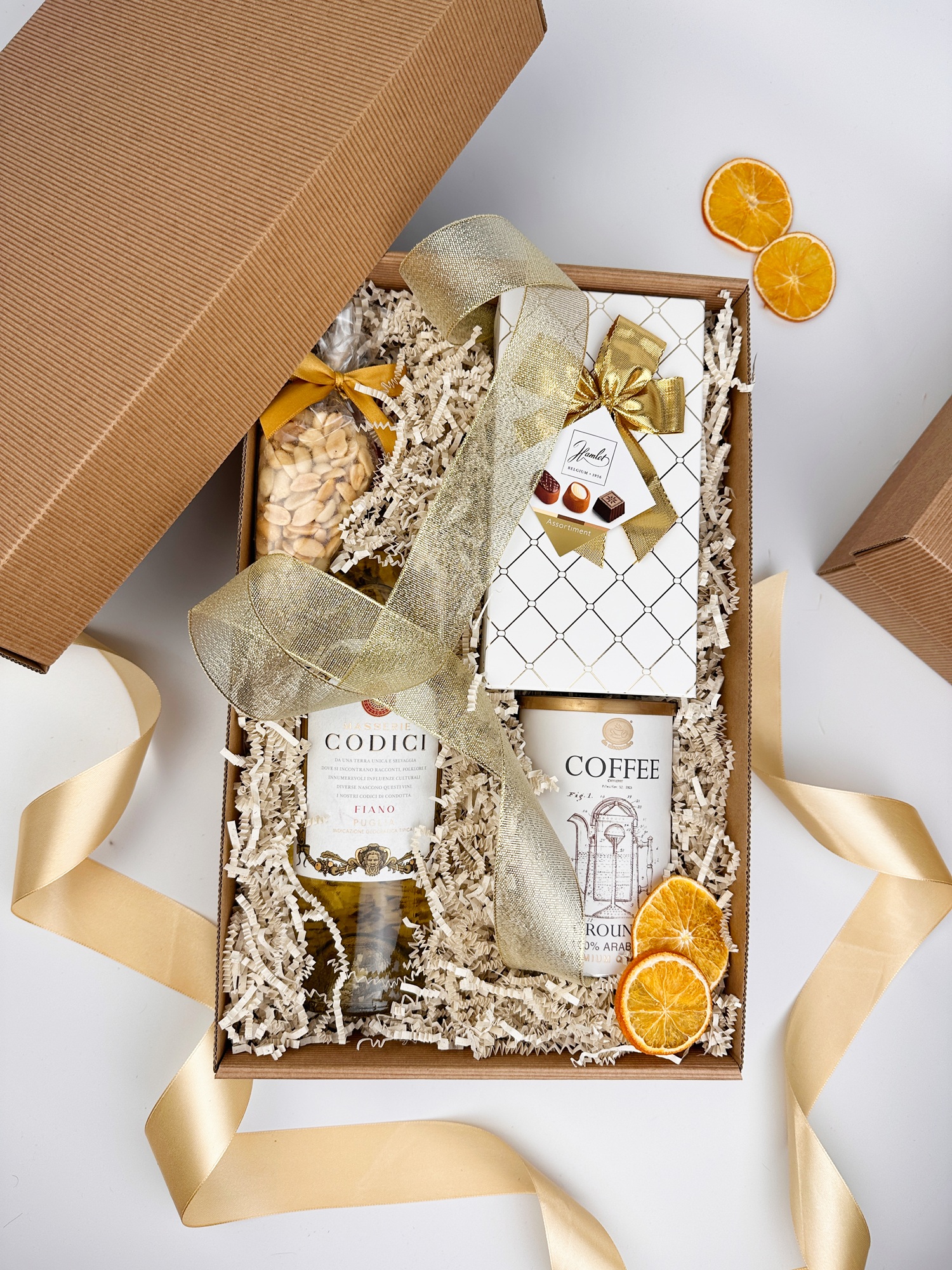 Zestaw prezentowy Złoty Upominek to elegancka kompozycja, która łączy klasyczne smaki w nowoczesnym wydaniu. Wino, kawa, wykwintne praliny i chrupiące orzeszki w estetycznym opakowaniu to doskonały wybór na każdą okazję. To prezent, który zachwyci każdego, kto ceni wysmakowaną prostotę i wysoką jakość.